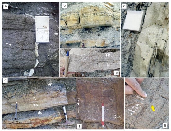 (a) Spaced planar-laminated sandstone corresponding to Tb3 interval after Talling []. (b) Massive sandstone (Ta) with planar-laminated tops (Tb2) interval in Talling []. (c) Massive sandstone (Ta) with rippled tops (Tc). (d) Laminated sandstones (Tb2 or Tb1) are followed by ripple cross-laminated tops. (e) Characteristic high-density turbidite with Ta interval at the base followed by laminated Tb2 interval. (f) Amalgamation surface between where subtle grain-size break occurs corresponding probably to a sandy debrite (clean sandy debrite at the base (Dcs) and discretely laminated mud (Td) at the top). (g) Mud clast (yellow arrow) floating in a medium-grained sandstone.