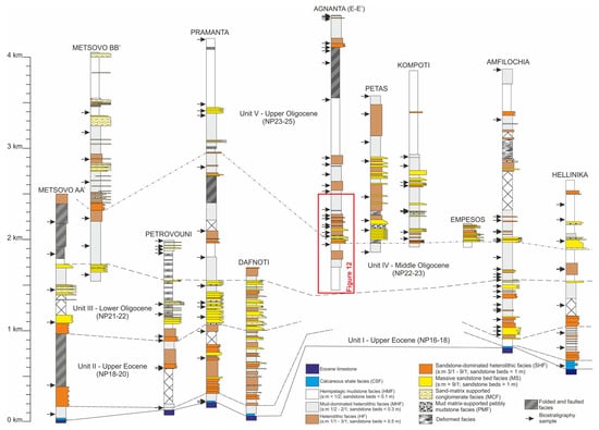 The scope of the present study is to assess the paleogeographic evolution of the middle Eocene to the late Oligocene foreland basin fill based on a detailed sedimentological analysis of the exposed submarine fan deposits and to perform a gross evaluation of the potential reservoir units. Detailed sedimentological identification of deep-water facies associations was carried out at 200 locations in 11 cross-sections across the basin (Figure 1). Data acquisition included recognition of basic lithological types (sandstones, mudstones, conglomerates), bed thickness measurements, and identification of thickening and thinning trends. Structural measurements (bedding planes strike and dip, fold axes, fault planes) completed the dataset. The measured thickness of the section presented in the study was corrected in areas of extensive folding (e.g., Metsovo Section). Additionally, Gamma Ray logs and cutting descriptions from Ayios Georgios 3 well [] were re-examined, and the results are displayed along with the studied cross sections. The well is located near Dafnoti village (Figure 1), and for the convenience of this study, it will be mentioned from now on as the Dafnoti Section. Ayios Georgios well is one of the few available subsurface data sources in the area.