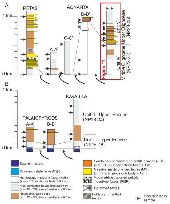 The biostratigraphic correlations presented in the next paragraph were based on the work of Vakalas [] and Vakalas et al. [], which cover the measured sections. The nannofossil marker species found in the samples were classified using the biozones proposed by Martini []. The results of the biostratigraphic analysis are presented in Figure 10 and Table 3.
