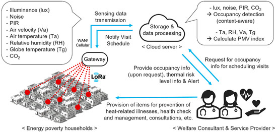Various welfare activities are conducted to prevent heat-related illnesses in those with energy poverty and provide economic support [4]. Welfare workers deliver goods and food for heat illness prevention and conduct health management through visitation surveys for energy poverty individuals. However, these caring services face challenges in efficient delivery for various reasons. The employment of energy poverty individuals is primarily casual with irregular working hours [5]. They often spend time in shelters during summer and winter due to the absence of heating and cooling appliances. Furthermore, their limited access to mobile phones hinders visit scheduling for welfare goods distribution and consultation. The lack of personnel to manage these individuals and the frequent absence of targets during welfare worker visits complicate the efficient provision of services.