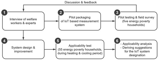 This section describes the implementation and applicability test of the proposed system. Figure 2 describes the methodology used for developing the proposed system. To properly construct the entire system, it was essential to first deeply understand the living environments of the energy poverty households. For this purpose, the characteristics of energy poverty households were investigated by conducting interviews with welfare workers and experts. Based on the initially derived system requirements, a pilot packaging of an IoT-based measurement system was created, and pilot testing and field survey were conducted. Based on the results of the first pilot test, discussions and feedback with experts were conducted. Through this process, the system was redesigned and improved to better suit the characteristics of energy poverty households. After that, 20 improvements of the measurement system were made, and an applicability test was conducted in the winter and summer for 55 energy poverty households. Based on the results of the applicability test, the applicability of core technologies in the proposed system, such as thermal environment monitoring and presence detection methods, was analyzed, and suggestions for an IoT-based monitoring system for energy-poverty households were derived.