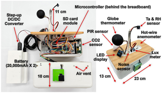The sensor nodes were designed to be easily installed in the confined spaces of energy poverty households, measured 230 mm long × 210 mm high × 130 mm wide, and were packaged in a tissue box, as shown in Figure 3. The case contained various modules, including an MCU, with thermal environment sensors located externally to minimize the impact of device-generated heat. The CO2 sensor was placed inside the case with an air vent to ensure air circulation. A total of 20 nodes were manufactured and used after calibration in the field tests.