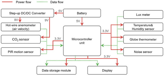 Figure 4 shows the block diagram of the constructed sensor node. The MCU receives 5 V power from the battery, which it transforms to supply 3.3 V power to the humidity, black bulb temperature, illuminance, noise, and PIR sensors. The CO2 and airflow sensors, requiring 9 V, are powered by 5 V from a separate battery, which is stepped up to 9 V using a step-up DC/DC converter. Due to the various modules in use, many data input/output ports are needed. Utilizing I2C or SPI communication methods allows for transmitting various sensor data through the same port, saving the number of required ports. In the implemented sensor node, the humidity and illuminance sensors and the OLED display module used I2C communication, while the black bulb thermometer and SD card module utilized SPI communication. The airflow, PIR, and noise sensors used digital input pins, and the CO2 sensor was configured to receive analog signals via analog pins.