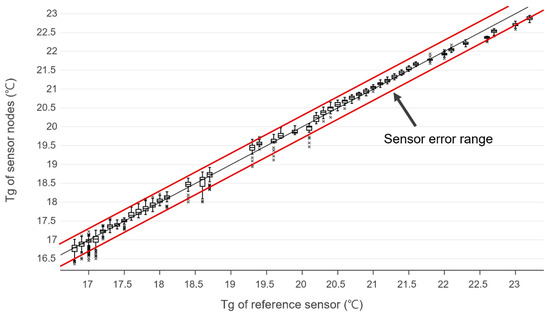 Figure 5 is a box plot comparing the measurements of the 20 calibrated black bulb thermometers with the reference sensor values. The x-axis represents the black bulb temperature measured by the reference device, and the y-axis shows the distribution of black bulb temperatures measured by the 20 sensor nodes. The red line indicates the error range of the used sensors. The figure shows that the calibration was successful, with measurement values falling within the sensor error range.