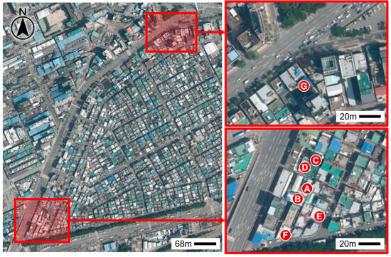 In this study, a pilot test involving 55 households was conducted using the implemented data acquisition system, based on which the applicability analysis and system improvements were carried out. The field test was conducted in Seo-gu of Daegu Metropolitan City, an area densely populated with households experiencing energy poverty. Figure 6 shows the location of the field test. These households tend to cluster in collective buildings where rent is affordable. The buildings in this area are mostly old, with living spaces divided into small rooms sufficient for minimal living. As indicated in Table 3, the target buildings have an average age of 43 years. Consequently, they had severely deteriorated insulation and air permeability in the exterior walls and window systems. They were mainly constructed with cement brick walls up to two stories high, making them vulnerable to ground infiltration and radiant heat from sunlight.