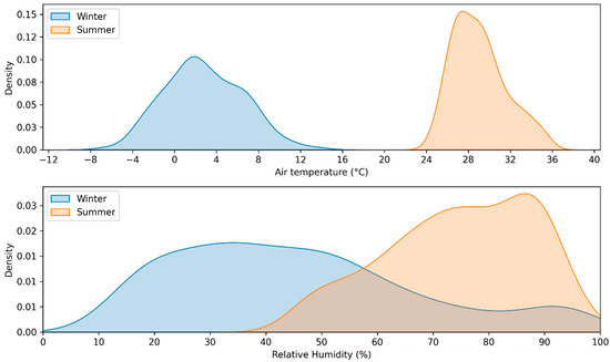 Figure 7 shows the distribution of outdoor temperature and relative humidity during the field test period. Climate data were obtained from the Automated Synoptic Observing System (ASOS) observations provided by the Korea Meteorological Administration (KMA). The summer period covered 8 days, from July 24 to July 31, and the winter period covered 22 days, from January 25 to February 6 and February 13 to February 21. The summer temperatures ranged from 24.7 °C to 35.5 °C, with an average of 29.02 °C, and a standard deviation of 2.53 °C. Winter temperatures ranged from −6.9 °C to 14 °C, with an average of 2.8 °C and a standard deviation of 3.76 °C. Humidity in summer ranged from a minimum of 46% to a maximum of 98%, with an average of 74.68% and a standard deviation of 13.05%. In winter, humidity ranged from a minimum of 12% to a maximum of 97%, with an average of 45.49% and a standard deviation of 21.85%. High humidity was observed during winter when it snowed or rained, typically following a prolonged dry period. Considering that the proposed system in this study aims to support caring services for energy poverty, these hot and humid summer conditions and dry, cold winter conditions were deemed suitable for conducting field tests.