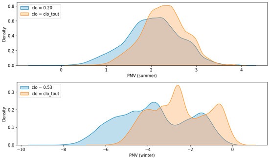 This study evaluated the use of a formula for representative clothing insulation based on outdoor temperature, as suggested by Schiavon and Lee [33] and described in ASHRAE Standard 55 [25]. Using outdoor temperature at 6 am, this formula was deemed suitable for winter clo calculation. Figure 8 compares the PMV values calculated using this formula (clo_tout) and the average clo from the survey. In summer, the difference between the two groups’ average values was minimal (0.24), while in winter, the difference was significant (1.21), which is consistent with the survey’s average clo of 0.53. However, the formula assumes a clo of 1 at temperatures below −5 °C. So, the formula is appropriate for winter clo estimation and is suitable for the system proposed in this study, offering versatility and applicability beyond the surveyed sites.