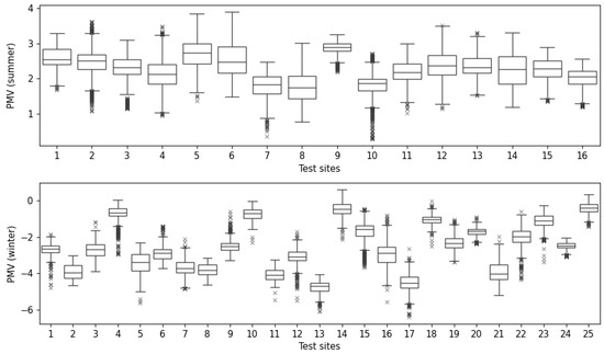 The distribution of PMV by location is shown in Figure 9. In summer, the PMV values showed an average of 2.27, a standard deviation of 0.49, a minimum of 0.27, and a maximum of 3.9. Approximately 6.4% of the total data samples exceeded a PMV of 3 (hot), raising concerns about heat-related illnesses such as heatstroke and prickly heat due to thermal stress in high-temperature environments. In winter, the PMV averaged −2.49, with a standard deviation of 1.36, a minimum of −6.4, and a maximum of 0.59. About 36.9% of the results were below −3 (cold), indicating greater thermal vulnerability in winter than in summer and suggesting the need for more support services for energy welfare during winter.