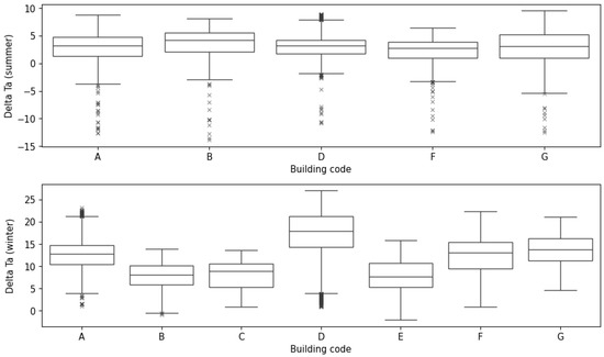 Figure 10 presents the distribution of indoor-outdoor temperature differences in the buildings where the experiments were conducted. During summer, a similar pattern was observed across all five buildings, with indoor temperatures being, on average, about 3 °C higher than outdoor temperatures. This was attributed to the characteristics of households experiencing energy poverty. These households have limited access to cooling devices such as air conditioners. The buildings they inhabit are typically low-rise and densely packed. Consequently, a high cooling load is formed due to solar radiation, but there is a lack of adequate cooling means, leading to high indoor temperatures. In winter, the indoor temperature was about 13.3 °C higher than the outdoor temperature, showing a greater difference than in summer. This result was due to minimal heating for survival in notably colder winter temperatures in the surveyed area. However, as shown in Figure 9, the thermal environment in winter was more vulnerable than in summer. As Figure 8 indicates, there were buildings (B, C, E) with relatively small indoor-outdoor temperature differences and vulnerable structures. This was attributed to differences in energy characteristics and heating system operations among buildings, indicating the need for energy poverty care that takes into account these building-specific characteristics.