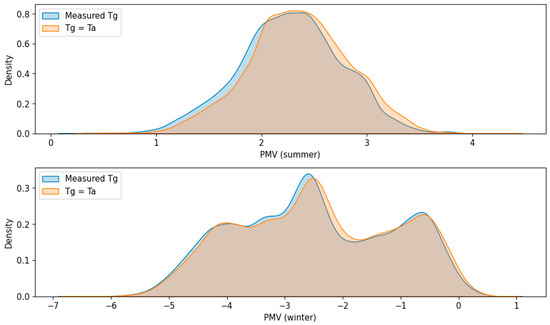 The usability of black bulb thermometers was evaluated by analyzing the difference between the measured black bulb temperatures and indoor temperatures. In summer, an average difference of 0.23 °C and a standard deviation of 0.24 °C were observed. In winter, the average difference was 0.26 °C with a standard deviation of 0.26 °C. Excluding some outlier values, the deviation between black bulb temperatures and indoor temperatures fell within the error range of the temperature sensor. Therefore, the PMV was analyzed assuming the black bulb temperature was identical to the indoor temperature without using a separate black bulb thermometer, and the results are shown in Figure 11. Similar patterns were observed in summer and winter with minor value differences of 0.079 in summer and 0.053 in winter. Considering the complexity of manufacturing black bulb thermometers, the need for self-calibration, and the increase in sensor node volume due to the installation of black bulb thermometers, it was deemed rational and cost-effective for the system proposed in this study to assume the black bulb temperature is identical to the indoor temperature without a separate measurement.