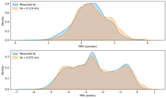 Next, the usefulness of air velocity sensors was evaluated by analyzing the measured air velocity values. In summer, the average measured value of air velocity at the target sites was 0.114 m/s with a standard deviation of 0.168 m/s. In winter, the average was 0.075 m/s with a standard deviation of 0.093 m/s, after mainly observing minor airflows. It was judged that such minor variations in airflow do not significantly impact the thermal environment assessment, and to verify that, the PMV was calculated using the average measured values of 0.114 m/s in summer and 0.075 m/s in winter and compared to the PMV calculated using the actual measurements. The results are shown in Figure 12, with similar distributions observed in both summer and winter. In summer, the difference in PMV values was an average of 0.079, while in winter, it was 0.055, thus only showing minor differences. The precise measurement of airflow velocity requires hot-wire type sensors. However, apart from specialized research equipment, the selection of sensors available on the market is limited. Also, due to their measurement technique requiring heat generation, they demand higher voltage than typical sensors, making them unsuitable for power-optimized sensor nodes. Therefore, it was concluded that it is more appropriate to use pre-measured air velocity as an average or representative value for commercial service in the system proposed in this study.
