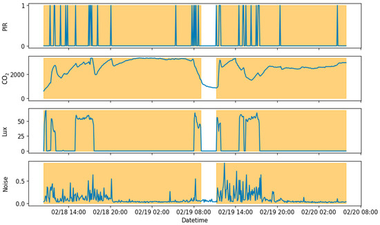 Example of sensor measurements by occupancy (colored section indicates occupied period).
