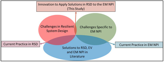The contribution of this study is visualised in Figure 1. A detailed literature review is carried out around the current practice and solutions in EV and EM new product development (NPD) and new product introduction (NPI), which is represented in blue in Figure 1 as “Solutions to RSD, EV and EM NPI in Literature”. The common practice methods and processes for new product development (NPD) that are followed in automotive and motorcycle industries fail to tackle the mass and volume constraint challenges specific to motorcycles, power and energy trade-off specific to lithium-ion batteries, and other challenges mentioned above that are associated with electric machines and power electronics specific to electric powertrains. After it was observed that the current practices in EV and EM NPI fail to tackle the challenges specific to EM NPI as shown in Figure 1 in green “Challenges Specific to EM NPI”, the literature review is extended to identify NPD solutions in different sectors. In the further literature survey, “Challenges and solutions in Resilient System Design (RSD)” are identified, as shown in Figure 1 in red. The innovation to apply the existing solutions in RSD NPI to EM NPI is the contribution of this study.