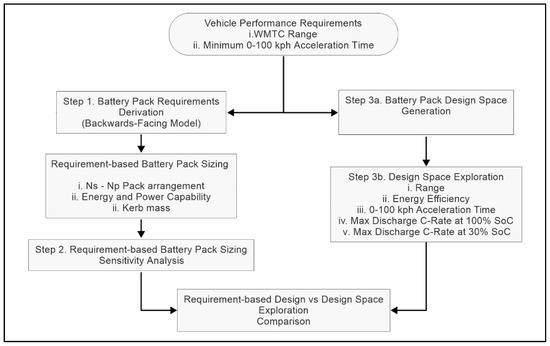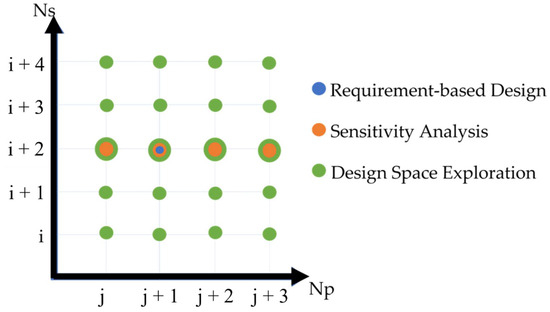 The proof of concept consists of three steps. In the first step, the requirement-based design results will be generated. The first step will demonstrate the current practice in EM design and development. A set of battery pack requirements is computed for an EM for given specifications, such as the WMTC vehicle range and the 0–100 kph acceleration time. In the second step, a sensitivity analysis is applied to calculate the battery pack specifications based on the requirements derived in the first step. Sensitivity analysis is essentially design space exploration in a single dimension of design variables. The second step will demonstrate 1D design space exploration in EV design, which is also available in the literature. The sensitivity analysis will be performed for the number of parallel strings required based on the change range and power requirements as well as vehicle mass. In the third step, a vehicle design space is generated. The design space is generated for number cells in series and number of parallel strings but can be generated for any independent variable associated with the battery pack, motor or chassis. Design space exploration is a multi-dimensional sensitivity analysis. Finally, the set of possible configuration options that were generated by design space exploration in the third step and the configuration options generated with the sensitivity analysis in the second step are compared and discussed. The representation of configuration options via requirement-based design, sensitivity analysis and the proposed design space exploration are visualized in Figure 2.