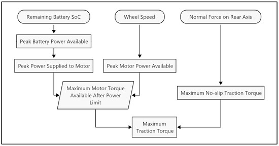 The PCPET uses a forward-facing model (FFM) to calculate the vehicle’s acceleration and speed during full acceleration for a selected powertrain configuration and identifies the minimum 0–100 kph time, taking into account instantaneous component limitations of the battery and motor. The FFM implemented in PCPET does not incorporate a full rider model, which can be able to trace any given drive cycle speed using a closed-loop feedback controller (such as a PID controller); hence, it lacks different levels of throttle and braking demands. However, it is designed to incorporate a throttle demand at 100% and a brake demand at 0% to simulate the rapid acceleration performance and top speed range. FFM decides the maximum torque capable of being delivered to the wheels using the logic shown in Figure 4. The available battery power and battery energy loss are identified depending on the SoC using open circuit voltage (OCV) and DC internal resistance (DC-IR) lookup tables as a function of SoC as well as the peak and continuous discharge power of the selected cell. Traditionally, wide-open throttle (WOT) refers to the full acceleration in PM; hence, WOT will refer to an accelerator at 100% for EM throughout the rest of this paper.