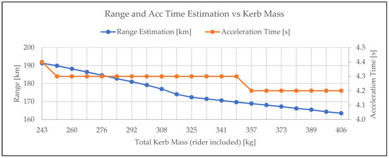The most common application in electric vehicle early-phase component sizing is to follow the sequential V-model practice. In V-model practice, first, a vehicle requirement list is defined based on the market study, benchmarking activities, etc. [25]. In the literature, in various examples, disregarding use cases or purposes of the EV being developed, component sizing is performed to match vehicle-level requirements conforming to a V-model sequential development approach [36,37,38]. As the V-model approach first freezes the vehicle targets and then performs the component sizing, that requirement-based approach is not the most suitable application for electric motorcycle development, as freezing the vehicle target requirements severely reduces the number of possible configuration options.