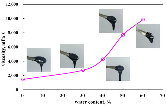 The viscosity and visible flowability of heavy oils with varied water contents are shown in Figure 3. As the water content increased from 0% to 60%, the viscosity increased from 1453 mPa·s to 9854 mPa·s, which reflects its influences on flowability. The microscopic analysis in Figure 4 could present the W/O droplets distribution and their size. The W/O droplets distribution became denser, and the overall self-emulsification degree of the heavy oil increased, resulting in an increased friction between the droplets, as well as the viscosity. However, as the water fraction increased, the droplets number increased, but the proportion of small droplets decreased. In this way, the W/O droplets size distributed around the larger range with the increase of water fraction.