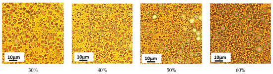 To figure out the emulsification behavior of heavy oil emulsions with varied water fractions, the rheological tests (50–80 °C) and microscopic analysis was conducted. Results showed that the viscosity of heavy oil emulsions increased with the water content increasing (Table 2 and Figure 3). The viscosity increased as the water fraction increased from 30% to 60%, revealing that the phase reverse point is less than 60% in this study. the phase reverse points of heavy oils in China are usually 20~50%, such as Tahe, Shengli extra-heavy oil, and Henan oilfield [65]. It could be inferred that the corresponding asphaltene and colloidal content of Bohai heavy oil samples may be even higher than areas listed above.