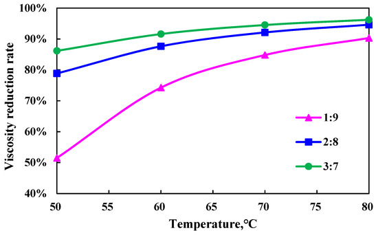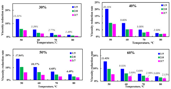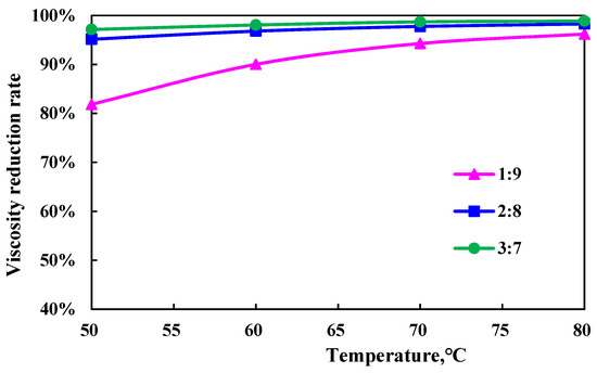 The viscosity reduction rates were calculated based on rheological tests as shown in Figure 8. It could be seen that the viscosity reduction rate of water in heavy oil emulsions increased, as the water content increased from 0% to 50%, while the viscosity reduction rate decreased when the water content was close to 60%. Heavy oil emulsions probably contained free water with the high-water fraction of 60%. Therefore, the emulsification occurred again between free water and introduced light crude oil, which increased the viscosity to some extent [59]. The transition was more pronounced during the dilution process with light heavy oil. Light heavy oil has a larger amount of polar component, and Hence, favor the emulsification between free water and crude oil more sufficiently, which could be proved in following microscopic analysis.