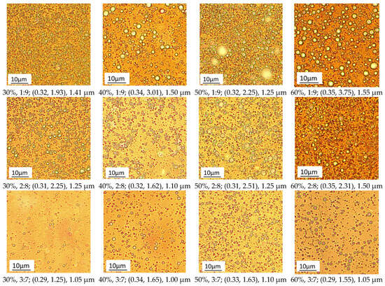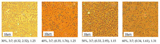 The microscopic results of W/O emulsions mixing with light heavy oil at 3:7. Notes. Contents below each picture are listed as follows: water fractions of heavy oil emulsions before dilution, dilution ratio; (minimum diameter, maximum diameter), median diameter.