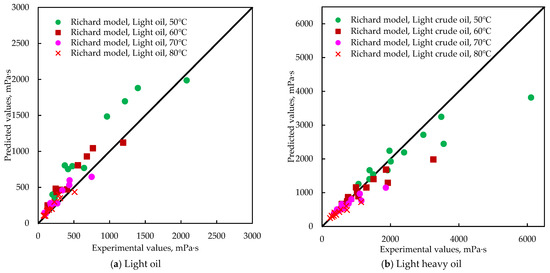 Viscosity prediction results based on Equation (4) under varying experimental temperatures are described in Figure 12, including diluted water in heavy oil emulsions by light oil (12 mPa·s) or light heavy oil (248 mPa·s). Predicted viscosity values of diluted water in heavy oil emulsions by light oil (12 mPa·s) are larger than measured values, while predicted viscosity values of diluted water in heavy oil emulsions by light heavy oil (248 mPa·s) are smaller than measured values. At the same time, the discrepancy between the predicted values and the measured values seem to have been influenced by the dilution ratio and water fractions. Reasons could be related to the emulsification and demulsification in Section 3.3. The demulsification is obvious in the mixing process of water in heavy oil emulsions and light oil, which benefits the viscosity reduction by dilution. The re-emulsification between free water and crude oil is pronounced in the mixing process of water in heavy oil emulsions and light heavy oil, which weakens the viscosity reduction by dilution. Hence, influences of water fractions, dilution oil viscosity and dilution ratio should be taken into full consideration when modifying the viscosity prediction model.