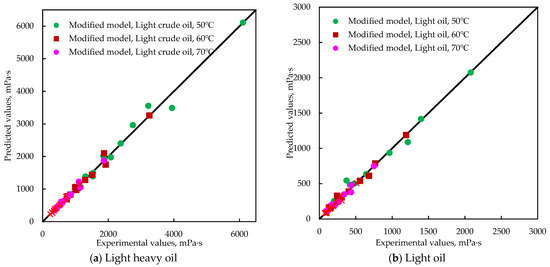 Comparison results between predicted viscosity of the modified model and experimental measured viscosity were shown in Figure 13 and Table 5. In addition, almost every correlation index R2 in each temperature group is larger than 98%, indicating a good applicability of viscosity prediction. Hence, Equation (5) is proposed to better suit the viscosity prediction of diluted W/O emulsions with considering sort of factors, including dilution ratio, water fractions, and dilution oil types.