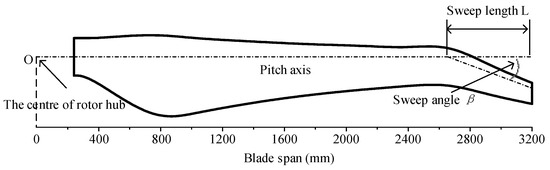 From Table 1, it is seen that along the span direction, the straight blade consists of 11 elements with varying chord lengths and twist angles. When designing the swept blade, the same hydrofoil chord lengths and twist angles as the corresponding sections of the straight blade are maintained. However, a sweep angle will be introduced at a specific span position, indicated by the sweep length L from the blade tip. From this position onwards, the corresponding hydrofoils will be parallelly displaced backwards along the sweep line defined by the sweep angle , as depicted in Figure 5.