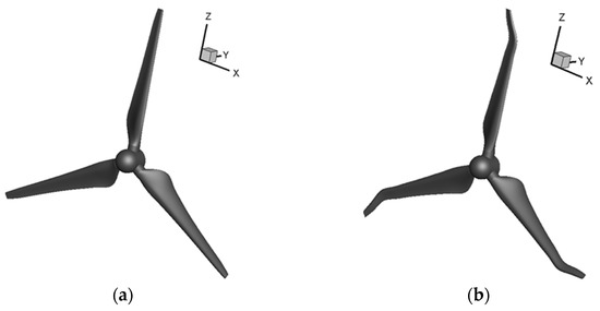 Numerical models of the TCT rotors with different types of blades. (a) Rotor with straight blades. (b) Rotor with swept blades.