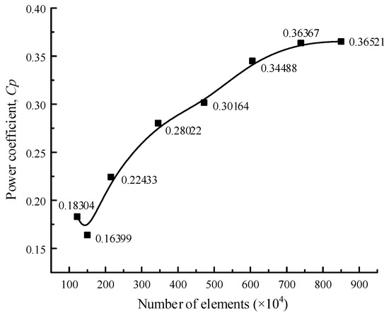 After successfully establishing the numerical model of the TCT rotor, the convergence check of the CFD calculation is conducted to determine the optimal number of elements for meshing the computational domain. Herein, the power coefficient of the TCT serves as an indicator for the convergence check. In the calculation, the velocity of the water flow is set to 1.2 m/s and the rotating speed of the rotor is set to 16 rpm. The power coefficient of the TCT is calculated by