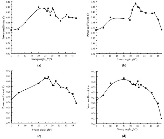 The results of the TCT power coefficient under different swept designs of the blade. (a) L = 0.272 m. (b) L = 0.544 m. (c) L = 1.088 m. (d) L = 1.36 m.