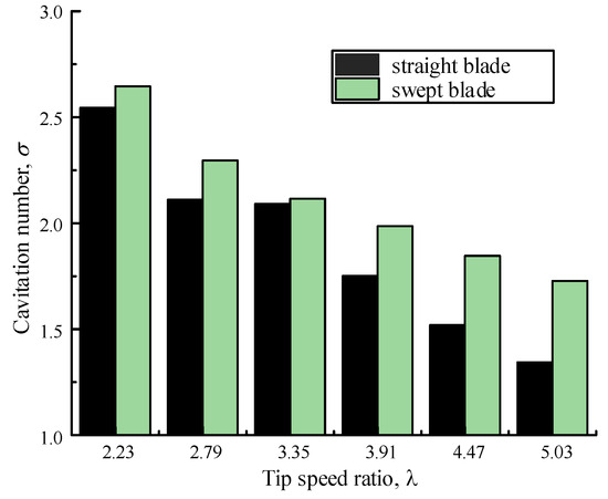 Observation of Figure 13 reveals that irrespective of whether straight or swept blades are used, smaller pressure areas consistently appear at the leading edge of the suction side surface in the tip section of the blade. This phenomenon implies that these specific areas are more prone to experiencing cavitation. Then, we use the minimum pressure in these areas and the following equation to calculate the cavitation number , i.e., [35]