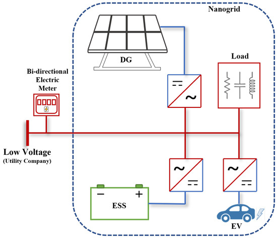 A nanogrid is a small-scale single-unit version of a microgrid, which is a localized group of electricity sources and loads that can operate independently from the main power grid or connect to it. Like a microgrid, a nanogrid can include multiple energy sources, such as solar panels, wind turbines, and energy storage devices [4,5]. A simple representative diagram of the structure of a residential nanogrid is presented in Figure 1.