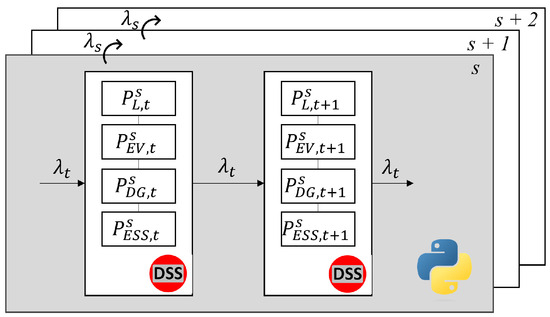 The technoeconomic evaluation methodology is implemented using Python scripts, and the OpenDSS software (via DLL) is employed to model and track energy exchanges between the nanogrid and the primary grid, as depicted in the schematic representation in Figure 2. Within this figure, signifies the power consumed by the nanogrid loads, represents the power used by EV charging stations, denotes the power generated by the internal generation system, and corresponds to the power derived from the Energy Storage System (ESS) operation. All values are expressed in kilowatts (kW) and are evaluated within the interval t of scenario s.