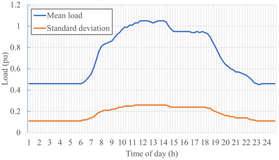 The total load of the microgrid is represented by a curve containing a consumption value for each time interval t within the evaluation time horizon T. In this case, in sample s generated via the MCS method, the values of for each interval t to be applied in (3) are obtained from a normal distribution with known mean and standard deviation. The mean value and standard deviation of the load can vary at different time points of the day, week, and year, with appropriate representations of peak and off-peak hours, weekdays, holidays and weekends, seasons, and natural changes in load characteristics and growth.