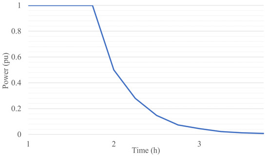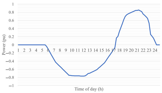 For this BESS operation, the “follow” mode of OpenDSS [7] is used, as illustrated in Figure 9. In this curve, expressed in per unit (pu) of the nominal power, negative values indicate battery charging periods, while positive values indicate energy injection into the grid. It is important to note that the specified power values in the curve may not always be achievable, as operational reserve constraints and maximum storage capacity can limit these actions.
