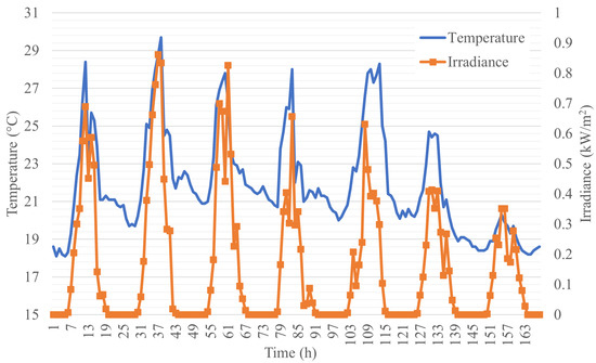 For the photovoltaic generation systems in Config. 2 and Config. 3, the features considered in the studies are presented in Table 3. The mean values of temperature and irradiance in the normal distribution were obtained from the meteorological database of the National Institute of Meteorology (INMET) [29] for the year 2022 in the city of São Paulo. Mean values for the first week are illustrated in Figure 5. Constant standard deviations of 5 °C for temperature and 0.098 kW/m for irradiance were applied.
