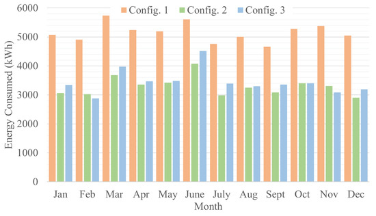 To further analyze the economic outcomes, we present the energy consumption figures for Configurations 1, 2, and 3 during the first year of the initial sampled scenario, as depicted in Figure 6. It is evident that Config. 1 exhibits higher energy consumption than Configs. 2 and 3, a consequence of its lack of self-generation. Between Configs. 2 and 3, there is a balance in these consumption levels, with Config. 3 having a slightly higher mean value (3449.96 kWh) compared with Config. 2 (3296.95 kWh). It is crucial to highlight that in Config. 3, which incorporates the nanogrid and BESS, the charging and discharging operations are determined by load thresholds. This operation primarily reduces the maximum energy demand, particularly during EV charging.