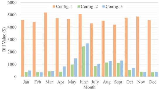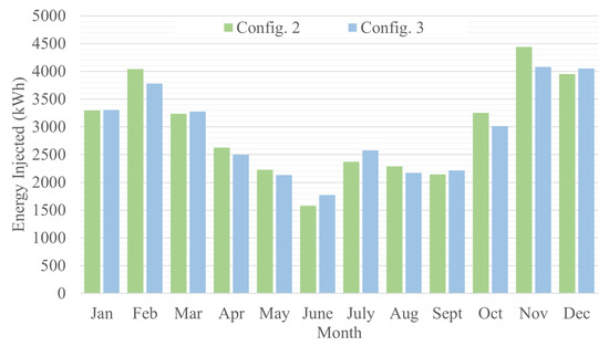 For an insight into surplus energy generation injected into the distribution grid during the first year, refer to Figure 7. Here, we observe that the amount of energy injected in Config. 3 (mean value of 2906.05 kWh) is slightly lower compared with Config. 2 (mean value of 2954.81 kWh) due to the presence of the BESS. Regarding energy bills, presented in Figure 8 for the first year, there is a significant reduction in Configs. 2 and 3 compared with Config. 1. This reduction is primarily attributed to the presence of the PVDG system in these configurations.