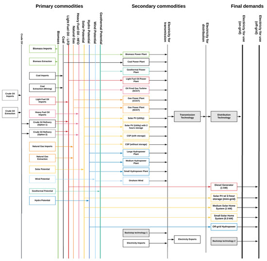 Various secondary datasets were used to source inputs and constraints to leverage Open Source Energy Modelling System (OSeMOSYS), which is a bottom–up, least cost energy systems optimization model that is useful for energy infrastructure planning at a country, regional, or global level [40]. OSeMOSYS has been used for scenario analysis for energy system planning in other LMICs such as in Bangladesh [41] and in Ethiopia [42]. Figure 1 shows the Reference Energy System (RES) used in this study, detailing all the technologies used and how they relate to each other. Parameter data values used in modelling are available in Appendix A, and for values not explicitly stated, those from Cannone et al. [43] were used (see Table A5 for a summary of all technologies included in the modelling). Note that no nuclear technologies were included since these were not defined as viable in DRC by Cannone et al. [43]. Instead, large-scale generation can be fulfilled by hydropower.