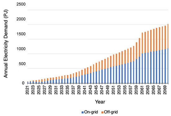 The Electricity Model Base for Africa (TEMBA) reference dataset [44] was used to set the annual industrial, residential, and commercial electricity demand for DRC (using the “SpecifiedAnnualDemand” parameter in OSeMOSYS). The selected model period for this study was set as 2021–2070. DRC-specific data from the Global Electrification Platform (GEP) [45] provided a projection for the annual least cost on-grid and off-grid generation, assuming 100% electrification by 2030. For the purposes of this study, the GEP split was used from 2021 through 2030, the last year of projection. In all subsequent years, the 2030 split was used (i.e., ~59% on-grid generation and ~41% off-grid generation) (see Figure 2). This assumption is a known limitation because the on/off-grid split is likely to change beyond 2030, but no other data sources were found to inform alternate ratios.