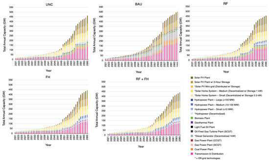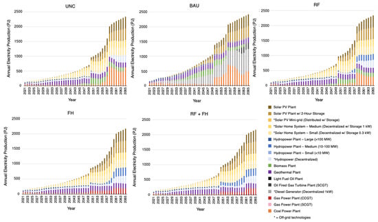 Figure 3 provides a view of the annual electricity production results for all five scenarios, while Figure 4 provides a complementary snapshot of the cumulative capacities by technology for each scenario. By 2065, production from RETs will be 66.2% for UNC, 30.3% for BAU, 81.8% for RF, 90.1% for FH, and 91.4% for RF + FH.