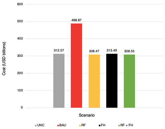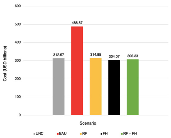 Based on the calculations above, the updated total system costs inclusive of the policy impacts of each scenario are shown in Figure 6. Costs for the UNC and BAU scenarios remained the same, while the RF scenario cost increased from the subsidy, and the FH scenario cost decreased from the tax. The RF + FH scenario cost both increased from the subsidy and decreased from the tax, but since the revenue generated from the tax exceeded the cost of the subsidy, the net change for RF + FH was a cost reduction. Previously, before the policy costs were included, the RF scenario was the cheapest overall, but with the updated system costs that account for the policy costs, the FH scenario becomes the cheapest. The policy pathway scenarios remained cost competitive with each other when the total cost for the model period including the government costs was considered.