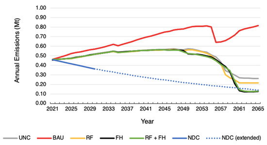 Considering the cumulative emissions for the period from 2021 through to 2065, the RF + FH scenario had the lowest level of emissions, followed closely by the FH scenario. The RF and UNC scenarios had similar cumulative emissions, while emissions for BAU were the greatest (46% higher than the RF + FH scenario).