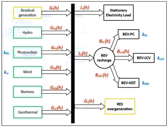 A simple mathematical model (illustrated with a scheme in Figure 2) was created to calculate, hour by hour, the balance between generation (residual generation and RES generation ) and electricity load (stationary load , BEV load and RES overgeneration ):