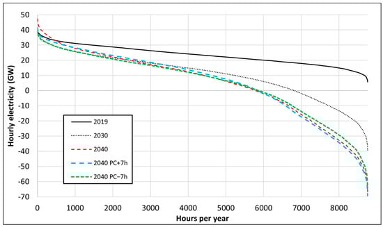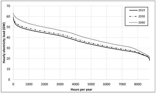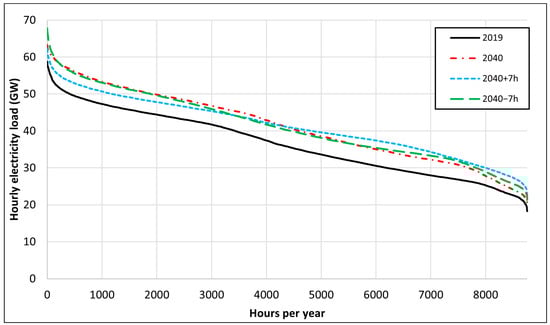 BEV charging profiles (BPC, BLCV, BHDT) are synchronized to the 2019 national load, day by day and hour by hour, and summed together to obtain yearly profiles of the total electricity load . Sorting those 8760 consecutive hourly loads in descending order, so-called “duration curves” can be derived for each case. A duration curve is often used in electric power generation to illustrate the relationship between generating capacity requirements and capacity utilization.
