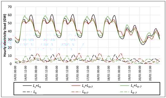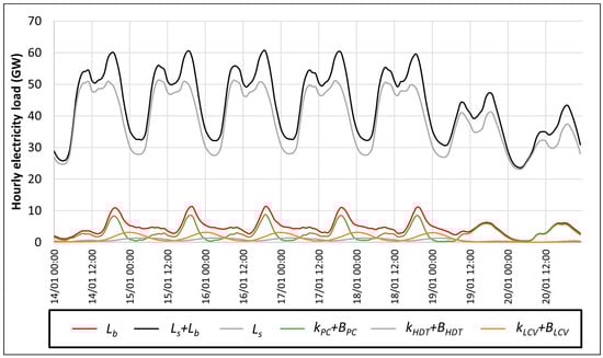 Analyzing the hourly profiles of Ls and Lb in detail, it is clear that the unmanaged strategy of BEV recharge causes a remarkable increase in the late afternoon load peak (Figure 4 shows a week in January as an example). In particular, BEV-PC recharge (green line in Figure 4) is the main contributor to that spike. Such high demand in those hours is a challenging issue for the electrical system, which is already facing a loss of RES generation in the same hours due to photovoltaic power decrease with sunlight. To cover that load, the system will use all remaining RES, use importation from other countries, and electrical storage if available, as well as calls to operational “peaker” thermal fossil power plants. It is self-evident that in this case, BEV-PC recharge may represent a problem that has to be managed, especially when BEV penetration in the entire fleet reaches a moderate/high percentage.