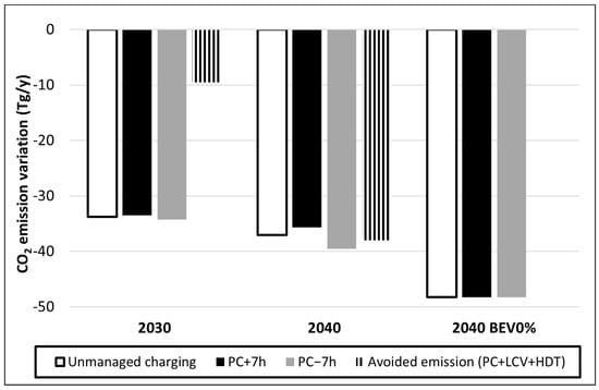 This paper’s research question is to evaluate the potential impact of large numbers of battery electric vehicles (BEVs) on the future electric grid, and whether the flexibility of BEV charging can induce enough system benefits to remunerate BEV users for the change in their recharging pattern. The considered scenario refers to the Italian situation and what might occur through the year 2040, where a share of BEV stock of 40% can be foreseen, as well as significant increases in PV and wind generation. Although this study is focused on Italy, its results are applicable, with minor differences, to several EU countries. This paper first shows that the future impact of increasing penetration of BEVs appears to be compatible with the expected growth of generation from renewable energy sources (RES) and the corresponding reduction in fossil fuel-based generation. It also gives an estimate of the CO2 emission reduction resulting from these changes, considering an unmanaged BEV charge profile and two different managed profiles that shift the car’s charging period to hours of the day when they have no negative impact on the grid and maximize the utilization of RES. Finally, it shows an evaluation of the economic benefits of displacing private car charging ranging from 4 to 10 cEUR/kWh, which could be used as tariff incentives to stimulate this displacing in recharging time.