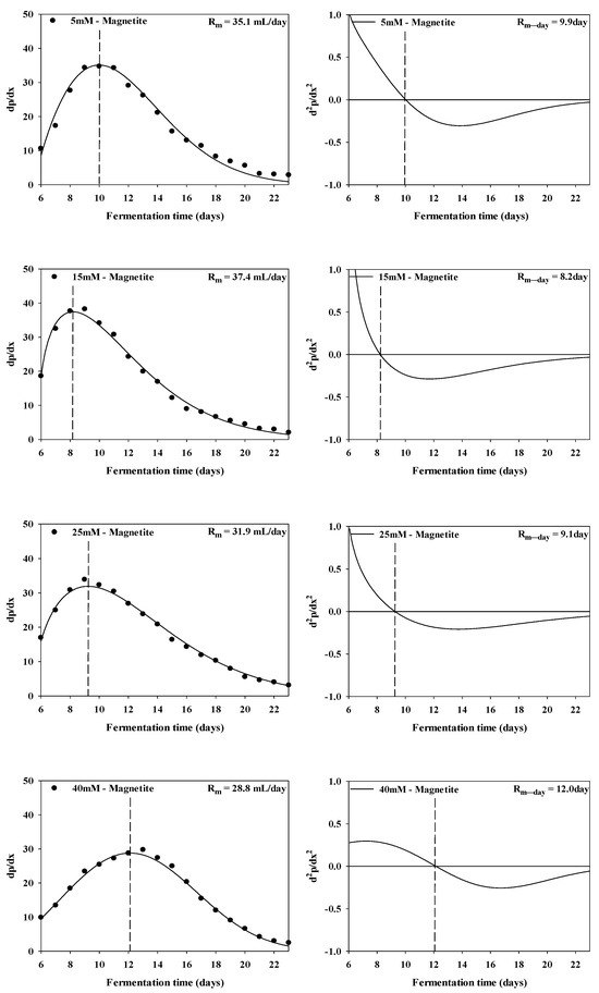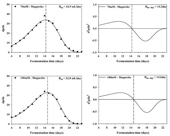 Analysis of maximum methane production rate and attainment day by the 1st and 2nd derivative from the cumulative methane production curve of Fe3O4 addition.