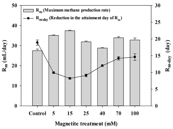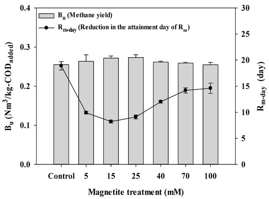 Bu and Rm-day by concentration according to the addition of magnetite (Bu mean of methane yield and Rm-day mean of reduction in the attainment day of Rm).
