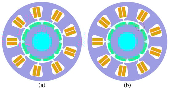 Physically modeling broken magnets in PMSMs involves the removal of sections from the magnets, accurately simulating the presence of cracks or fractures. By physically removing parts of the magnets, the effective magnetic field strength in the motor is reduced. It is important to note that physically modeling broken faults by altering the magnets is a controlled and deliberate process performed for experimental or testing purposes. In real-world scenarios, broken magnets can occur for various reasons, such as mechanical stress or electrical overloading, and they are typically considered undesired and unintentional faults [27]. As a result, the motor may experience reduced output torque, decreased efficiency, increased current harmonics, and increased heating in broken magnet conditions. These effects can negatively impact the motor’s overall performance and reliability [28]. In this study, the broken magnet was fitted on a PMSM. Figure 1a depicts the FEM representation of the intact rotor of the PMSM, whereas Figure 1b illustrates a side view of the rotor with a broken magnet in one pole. In this case, a section corresponding to roughly 3% of a single permanent magnet (PM) area was deliberately removed from the magnets, forming one pole.